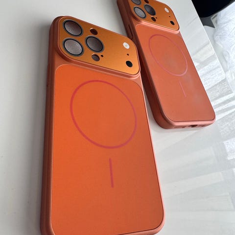 Telefonen deksel har trippelt kamerasystem på baksiden og stor skjerm. Bakdekselet på bildene viser MagSafe-ring, som indikerer støtte for trådløs MagSafe-lading. Modellen har USB‑C-tilkobling (synlig på bildene) og fysisk sideknapp og volumknapper.