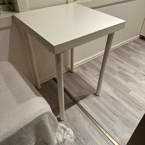 IKEA-skrivebord med hvit rektangulær bordplate og grå, runde ben. Bordet har et enkelt og funksjonelt design som passer til hjemmekontor, arbeidsrom eller som arbeidsbord. Materialet er vanligvis laminert bordplate med metallben, noe som gir en rengjørbar og robust arbeidsflate. Høyden på bordet kan justeres.