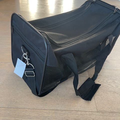 Kjæledyrsekk i svart med nettingpaneler på flere sider for lufting og innsyn.