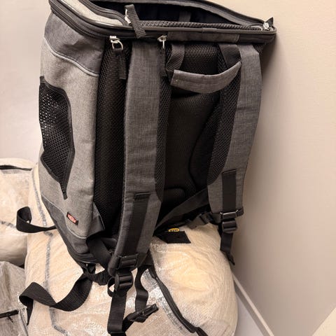 Ryggsekken har polstrede skulderstropper, brystreim og justerbare stropper for bedre bærekomfort. Egnet til transport av mindre kjæledyr, for eksempel katt eller liten hund, på tur eller reise der dyret skal bæres på ryggen.