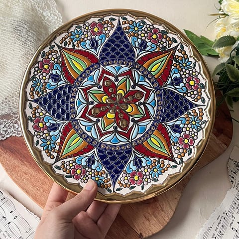 Vintage Cearco keramikkfat / platte med emaljedekor og 24 karat gull. Dette er et lekkert håndmalt spansk keramikkfat / platte, produsert av det kjente merket Cearco. Slike fat / platte er kjent for sin detaljerte fargede emalje (i lyseblå, mørke blå, hvit) og bruk av 24 karat gull. Teknikken kalles ofte "cuerda seca" (tørr snor) som gir de karakteristiske opphøyde linjene mellom fargene. Fatene er primært dekorative veggfat eller samleobjekter, men kan også brukes som serveringsfat eller brikker for varme tallerkener. På baksiden er fatet stemplet Cearco, Håndmalt med emaljer og 24 karat gull, laget i Spania. Hvor mye 24k gull fatet er belagt med er usikkert, men 1 gram 24 karat gull pr. i dag koster kr. 1485.- Diameter 22 cm, høyde 1,5 cm. Vekt: 585g. Meget flott, hel og pen. Selges kr. 450.- Hentes Jevnaker eller sendes. Ved sending tilkommer frakt kr. 70.- med sporing hos Postnord. Pakker godt. Tar vipps.