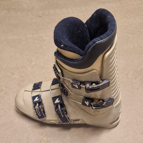 Alpinstøvler i sølvfarge. Støvlene har flere justerbare spenner foran for god tilpasning rundt fot og legg,
