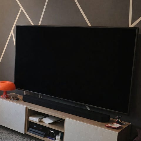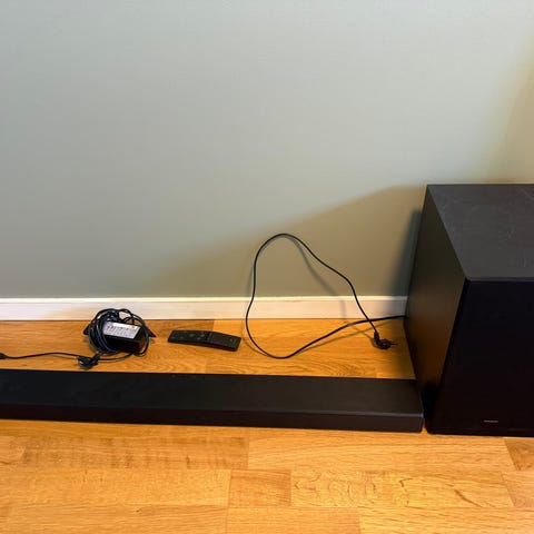 Samsung HW-R560 med tilhørende subwoofer. Lydplanken gir forbedret TV og filmlyd sammenlignet med innebygde TV‑høyttalere. Subwooferen står separat på gulvet og gir dypere bass. Systemet passer til bruk i stue eller TV‑rom for film, serier, spilling og musikkavspilling. Alt fungerer som det skal, kontrollen følger ikke med.