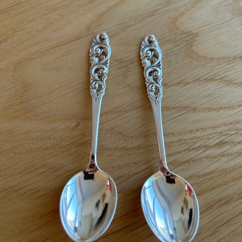 T-skjeer fra Telesølv selges for 300 pr stk som er 1/4 av ny pris, som er 1193,-. De er 11,3 cm, Jeg er også interessert i å bytte til kakegafler fra opphøiet rose i stedet for salg, lite brukt