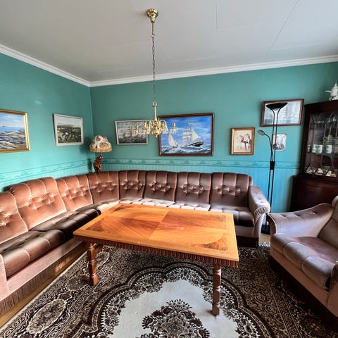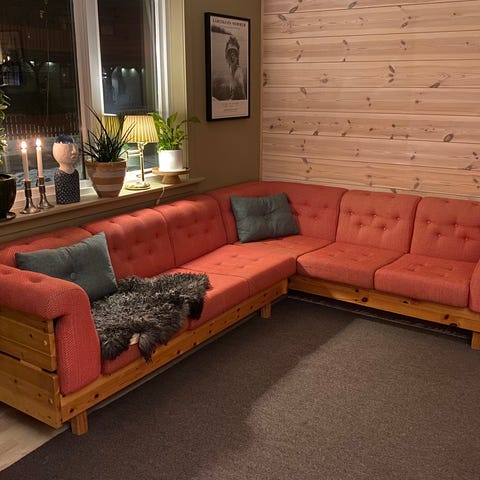 Sofa er opprinnelig en hjørnesofa fra 80- tallet. Se gammelt bilde. Deler til hjørnesofa følger med, dessverre noen riper på delene av tre etter lagring. Putene er hele og fine.