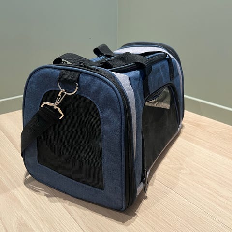 Kjæledyrbag transportveske i blå tekstil med sorte nettingvinduer på tre sider.