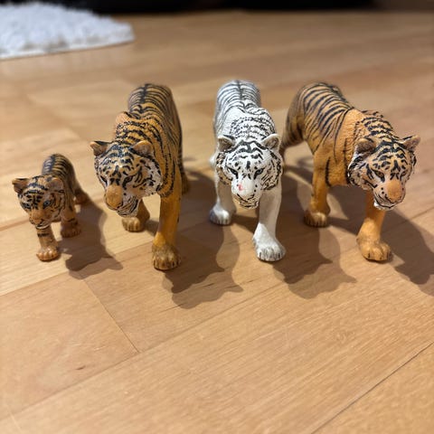 Schleich dyrefigurer sett. Inneholder flere plastfigurer av dyr, blant annet løver, kattunger, ulv og panda. Figurene er naturtro malt og i liten størrelse som passer til lek på bord, gulv eller sammen med andre lekesett. Egnet som samleleker eller til rollelek med dyr.