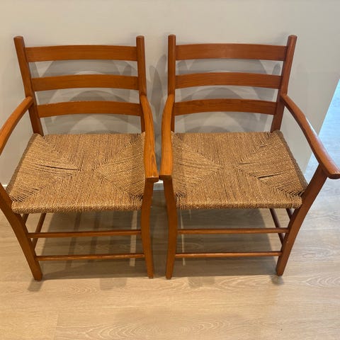 Stolene er i god brukt stand med normal aldersslitasje i overflater. Et par originale treplugger mangler som følge av alder. Stolene er stabile og funksjonelle, og selges slik de står.