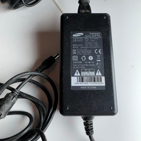 Samsung 7110-AD-051 GT AC/DC adapter for elektronisk utstyr. Adapteren har inngang 100–240V ~ 50/60 Hz og utgang 19V 4,74A (ca. 90W). Farge svart. Standard rund DC-plugg, egnet for kompatible Samsung-enheter og annet utstyr som krever samme spenning, strømstyrke og pluggtype. Strømkabel mellom adapter og enhet er fastmontert, mens nettstrømkabel til vegguttak kobles til via egen kontakt på adapteren.