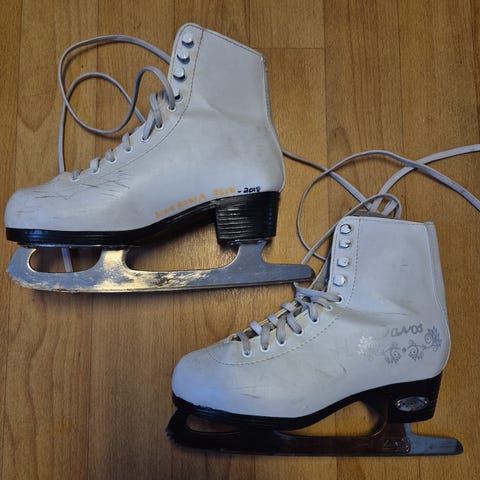 Ukjent merke kunstskøyter for barn i størrelse 37. Passer 38 med vanlig sokk bare. Klassisk hvit modell med snøring og dekor med snøkrystermønster på siden. Skøytene har høy skaft for støtte rundt anklene og polstret innside for økt komfort. Blad i metall med hælparti i plast. Egnet til bruk på isbaner og skøytebaner for generell skøyting og enkel kunstløpstrening.