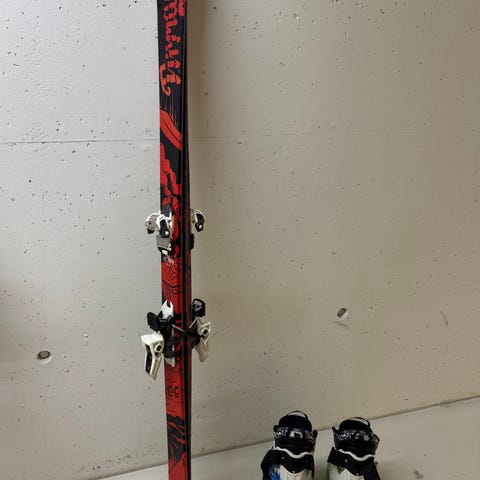 Nordica alpinski med integrerte bindinger i rød og svart farge. 80 cm for de minste barna. Bruksmerker finnes men masse skiglede igjen.