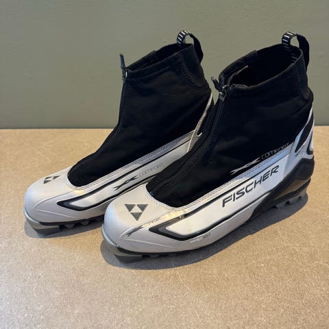 Fischer langrennsstøvler i sølv og svart str 39. Støvlene har glidelås foran og overtrekk som dekker lissesystemet. Egnet til klassisk langrenn.
