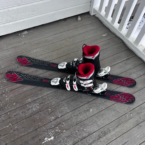 K2 twintip alpinski med bindinger og Lange skistøvler.