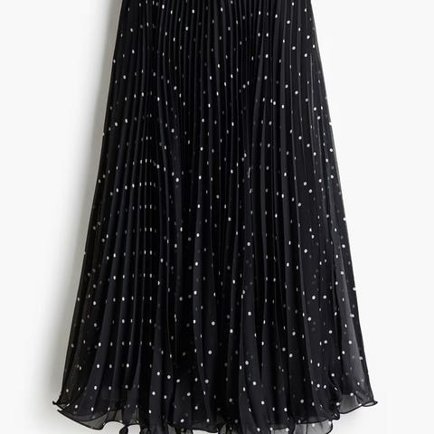 H&M plissert skjørt for dame i størrelse L. Skjørtet er svart og laget av polyester. Modellen har elastisk linning i livet og tett lagte folder som gir et plissert uttrykk. Passer til hverdagsbruk eller mer formelle anledninger, avhengig av hva det kombineres med.