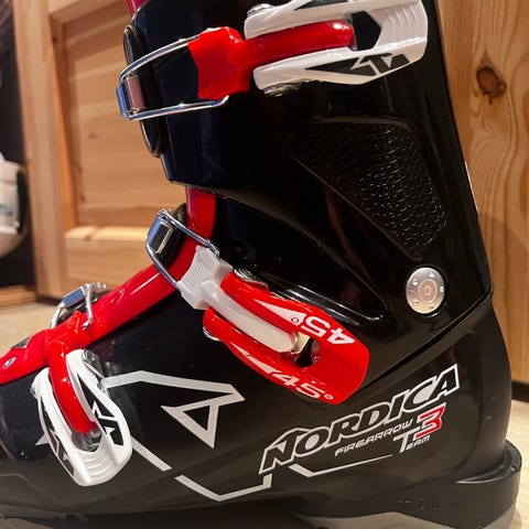 Nordica Firearrow T3 alpinstøvler i størrelse 24.5 (290 mm sålelengde). Støvlene har hard ytterskall i plast og mykere, polstret innerstøvel for komfort. Modellen har flere justerbare spenner i metall og plast for god tilpasning rundt fot og legg. Fargekombinasjon svart og rød med hvite detaljer.