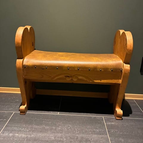 Benkk med utskårne gavler og blått sete. Rammen er i lyst treverk med dekorative treskjæringer i endestykkene. Sitteflaten er polstret og trukket i et blått stoff med lyst mønster. Benken kan brukes som ekstra sitteplass i gang, stue eller soverom, eller som avlastningsmøbel ved for eksempel seng eller entré.