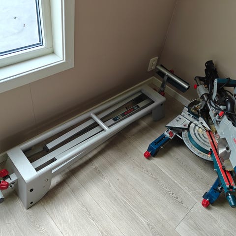 Bosch kapp- og gjærsag med stativ. Sagen står montert på et justerbart sagstativ med støtteben. Egnet for kapping og gjæring av treverk og lignende materialer ved bygge- og oppussingsarbeid. Stativet gir stabilitet og bedre arbeidsposisjon ved lengre emner.