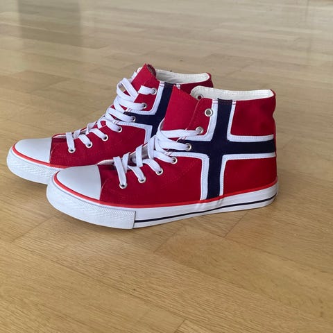 Ubrukte sko med Norgesflagg-motiv. Passer godt til russ.