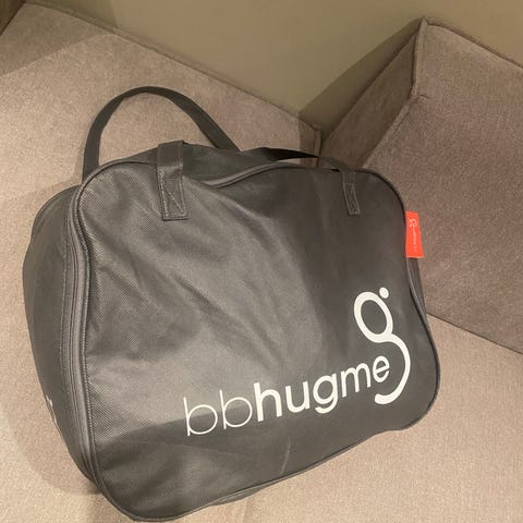 bbhugme gravidpute i grå farge. Puten er utformet for å gi støtte til kropp under graviditet. Den kan justeres etter behov ved hjelp av knyteløsning i endene, slik at fasthet og form kan tilpasses ulike sovestillinger og støttebehov. Leveres i bbhugme oppbevaringsbag med bærehåndtak.