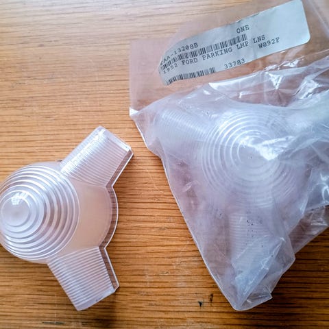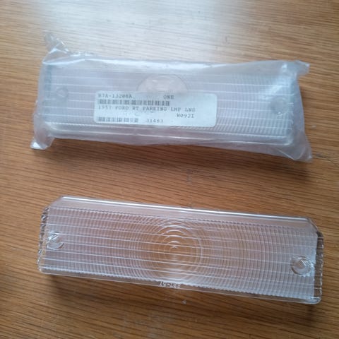 1966 Fairlane 1 par parklys glass, nye, repro, orange, tilsvarer Ford C6OZ-13208-AR, pris kr 800. Har også pakninger, pris kr 165 pr par. Sender gjerne i posten, porto kr 76.