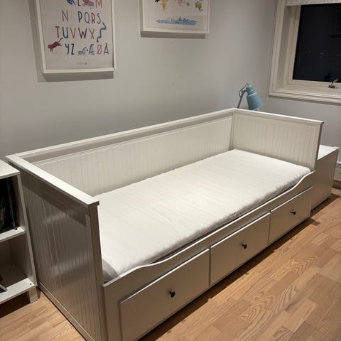 IKEA dagseng med tre skuffer i hvit utførelse. Modellen har rygg- og sidepaneler, samt sengebunn med lameller. Under sengen er det tre romslige skuffer med knotter i front for oppbevaring av sengetøy eller annet. Egnet som enkeltseng eller dagseng i soverom, gjesterom eller oppholdsrom. Flere overflater viser bruksspor og riper, se bilder for detaljer.