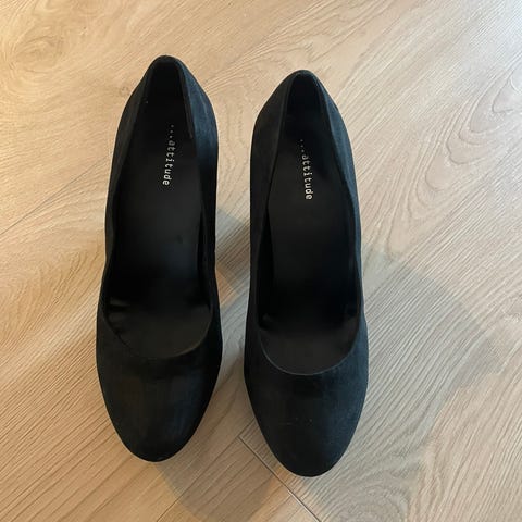 Kjempetøffe damesko med høy hæl fra Attitude. Minimalt brukt og da kun inne. Festes med en knapp over vristen.