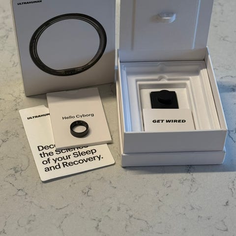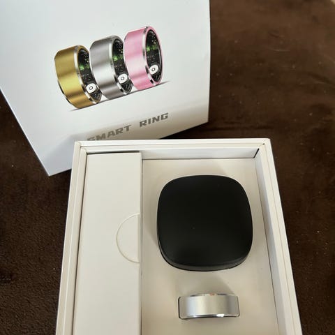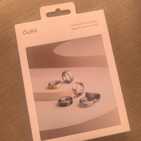 Oura ring Horizon («silver finish»). Ringen er laget i rustfritt stål med innvendig elektronikk og sensorer. Den brukes som en smartring for måling og registrering av ulike aktivitets- og kroppsmålinger ved tilkobling til kompatibel app og enhet. Leveres med lader som vist på bildene.