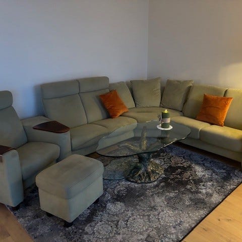 Lite brukt Ekones Arion 3-seter stressless sofa. Følge med puff/bord med oppbevaring.