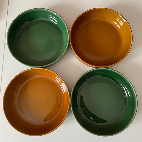 2 har en nydelig sennepsgul farve og 2 av de har en nydelig grønn farge . De er hele og pene / pent brukt , men dog må annmerkes at de 2 grønne har en blank prikk hver på undersiden .