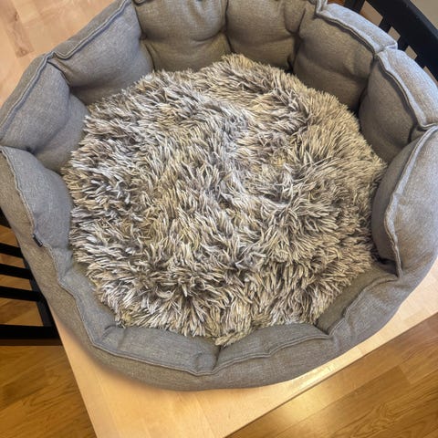 Laboni ortopedisk hundeseng i teddy-stoff i beige. Forkanetet modell med myke, polstrede kanter og pute i bunnen for økt komfort. Dette er kvalitet fra Sveits. Mål 85 x 66 x 22. Vaskbar. Silikonserte fibre, så absolutt en meget god seng særlig for eldre hunder. Selges da db ble for stor. Brukt ytterst fåtall ganger.