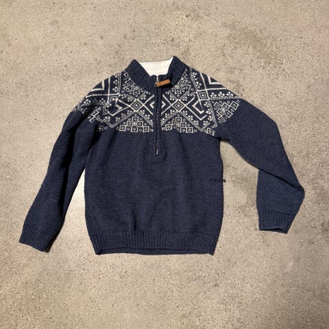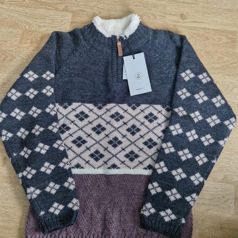 Tretorn mønster genser i ull for jente i størrelse 98./104Genseren er brun med mønster rundt halsen i kontrastfarger. Den er strikket i ull, med ribbestrikkede kanter nederst og ved ermene. Passer som varm hverdagsgenser eller mellomlag på kjølige dager.