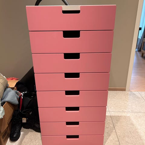 IKEA Småstad garderobeskap, hvitt med rosa dører.