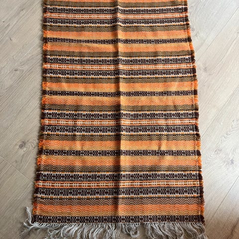 Fint vevd ullteppe. Fremstår som ubrukt. Kan brukes som teppe på gulv, seng eller koseteppe i sofaen. L:218cm, B:130cm
