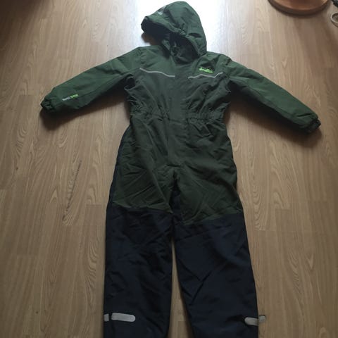 Pent brukt vinterdress i størrelse 104 for barn, unisex. Dressen har hette, glidelås i front og lommer med glidelås. Refleksdetaljer på ermer og ben gir bedre synlighet. Perfekt til barnehagen i kaldere vær for barn rundt størrelse 104.