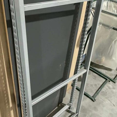 6 stk panel egnet til butikkinnredning eller oppbevaring. Panelene har horisontale spor til bruk med ulike typer oppheng, som hyller, kroker eller bøyler. Overflaten er glatt og lys, tilpasset innendørs bruk. Passer til organisering og presentasjon av varer på vegg i for eksempel butikk, lager eller garasje, der man ønsker fleksibel plassering av utstyr og produkter.