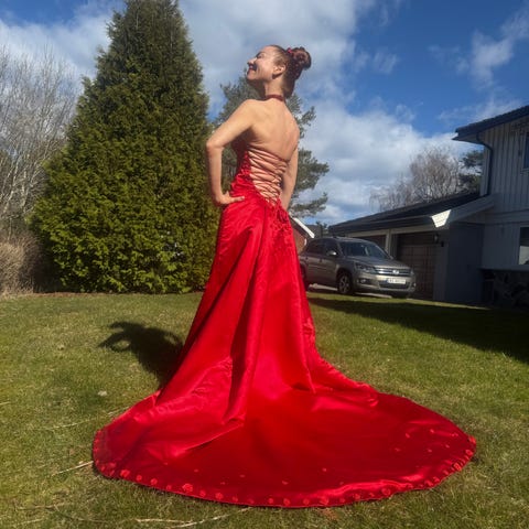 Leter du etter en unik kjole som virkelig skiller seg ut? Jeg selger en fantastisk festkjole i en dyp, elegant rødnyanse. Denne skiller seg fra masseproduserte plagg med sine vakre, håndlagde perlebroderier og klassiske hjerteformede utringning.