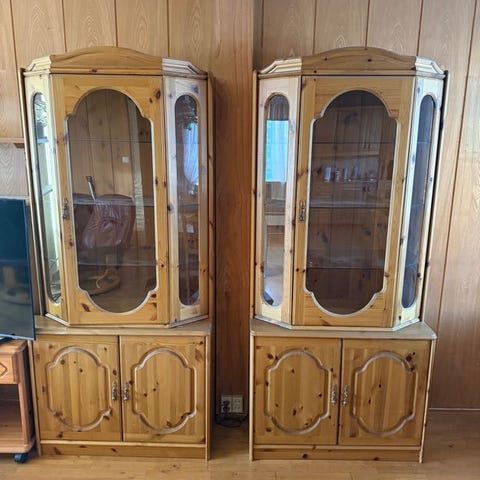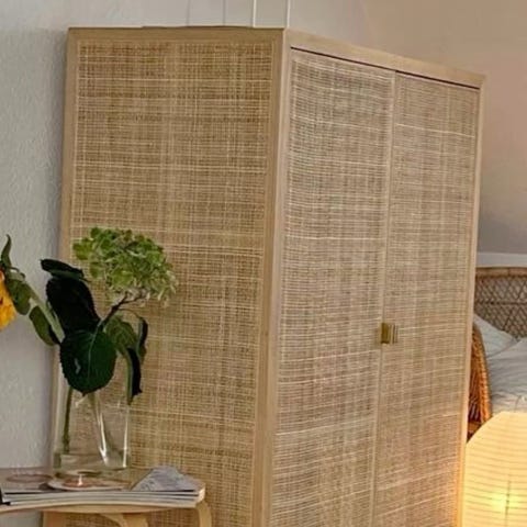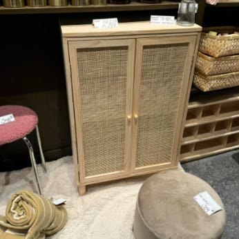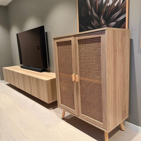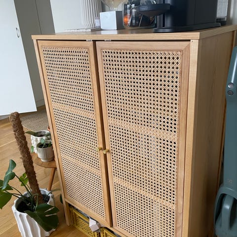 Skap / sjenk fra Søstrene Grene i furu med dører i rotting. Veldig fint møbel. Treet er ubehandlet, så det går an å male eller beise om man ønsker. I god stand med noen få bruksmerker. Godt med lagringsplass på innsiden. Har byttet ut de originale knottene med runde knotter fra Ikea, men de originale knottene følger med. Må hentes, men det er ganske lett å bære.
