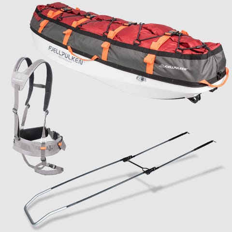 Fjellpulken pulk med drag og trekk i rød farge. Pulkens skrog er i hardplast for økt slitestyrke. Den leveres med polstret trekk i tekstil med strammebånd og festepunkter for sikring av bagasje. Draget er i metall med hoftebelte og seler for trekking. Egner seg til transport av utstyr på ski- og vinterturer.