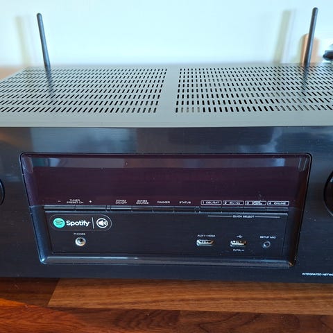 Receiveren er egnet som sentralenhet i et hjemmekinoanlegg med flere høyttalere og ulike bilde- og lydkilder. Fjernkontroll følger med, som vist på bildene.
