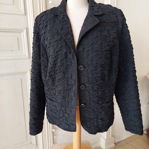 Sophie Faroh jakke for dame i størrelse M. Jakken er blå og har en strukturert overflate med kontrastkanter. Den lukkes med knapper foran og har to klaffelommer foran. Ermene har knappedetaljer ved mansjettene, og det er en dekorativ stropp bak på ryggen.