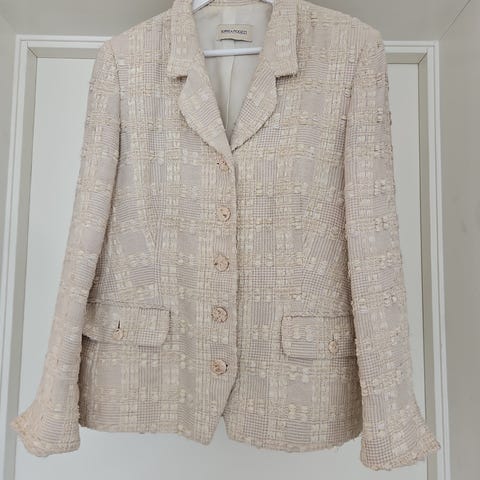 Materiale ifølge merkelapp: 40 % polyester, 39 % ull, 20 % viskose og 1 % elastan. Jakken har glatt fôr på innsiden. Passer som penjakke eller blazer til hverdags- og kontorbruk.