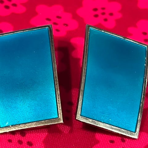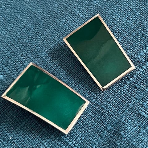 David-Andersen øreklips i sølv for dame. Øreklipsene har rektangulær form med grønn emalje i front og sølvfarget kant. Baksiden har klipslås og er stemplet med produsent og sølvkvalitet. Passer som tilbehør til både hverdag og mer formelle anledninger.