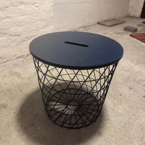 IKEA sidebord med integrert oppbevaringskurv i hvitlakkert metall. Bordet har rundt bordplate i hvit utførelse med utskåret håndtak for enkel av- og påtaking av lokket. Understellet består av en åpen trådkurv i metall som gir god oversikt over innholdet og kan brukes til oppbevaring av for eksempel pledd, puter eller leker. Nøytral hvit farge som passer inn i ulike rom som stue, soverom eller gang.
