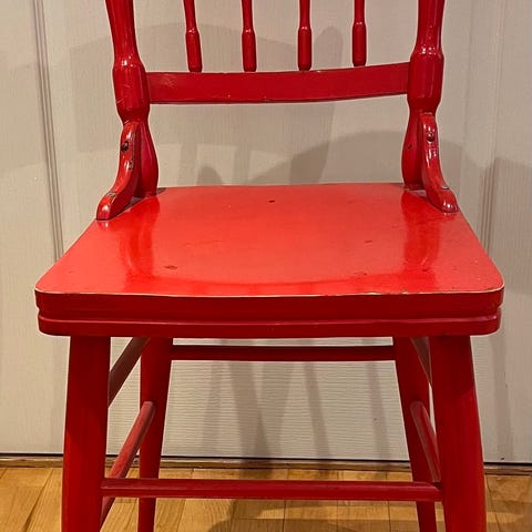 Sjarmerende vintage barnestol i heltre med original rød farge. Stolen har klassisk utforming med fem ryggspiler, svakt buet toppstykke og solide, skråstilte ben med tverrforbindelser for god stabilitet.