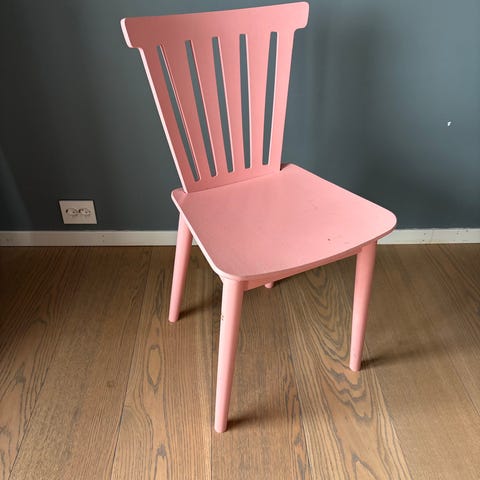 Stolen fremstår som stødig og funksjonell. Den bærer preg av alder og bruk med naturlig slitasje i overflaten, mindre merker og riper i malingen, noe som gir den et autentisk uttrykk. Ingen synlige løse deler eller konstruksjonssvakheter.