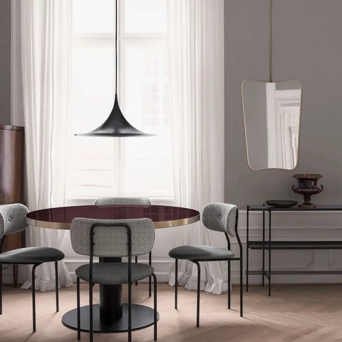 Gubi Semi pendellampe ø70 i hvit utførelse, designet av Claus Bonderup og Torsten Thorup. Lampen har den karakteristiske, traktformede skjermen som gir nedadrettet lys, egnet over spisebord, kjøkkenøy eller i stue. Passer vanlig lyspære, anbefaler en der tuppen er dekket.