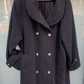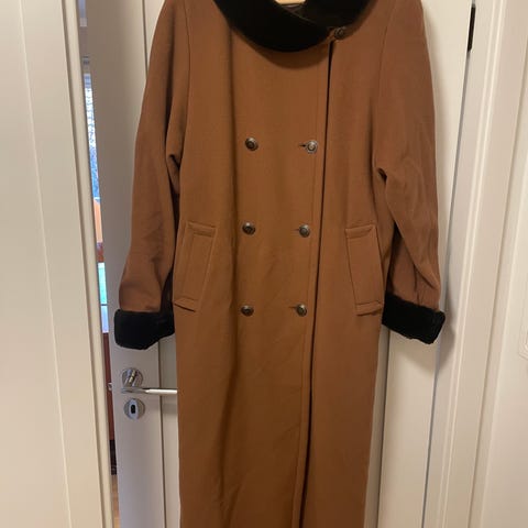 Kello kåpe i størrelse M. Kåpen er beige og laget i en kasjmirblanding med ull, med fôr på innsiden. Modellen har klassisk krage, knappelukking foran og to frontlommer med klaff. Lengden går ned mot knærne, og ermene har knappedetaljer nederst. Egnet som yttertøy i kjøligere vær.