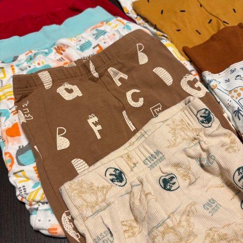 Bodyer, bukser, nattdrakter, 2 gensere, 1 ullbukse og ett «joggesett». Klærne er lite brukt, da de fort ble for små. Fra røyk- og dyrefritt hjem. Vasket med allergivennlig vaskemiddel.
