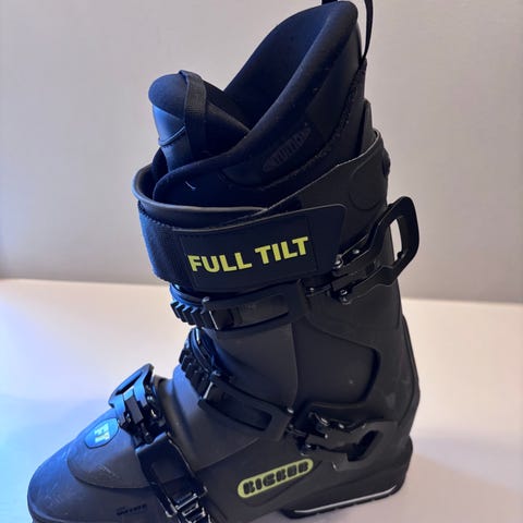Head Thrasher alpinstøvler i svart. Størrelse 260–265 mm (sålelengde). Støvlene har flere justerbare spenner og power strap øverst for bedre tilpasning rundt leggen. Egnet til alpint/frikjøring for brukere som passer inn i denne sålelengden. Design med gule detaljer og tydelig Head-logo på siden.