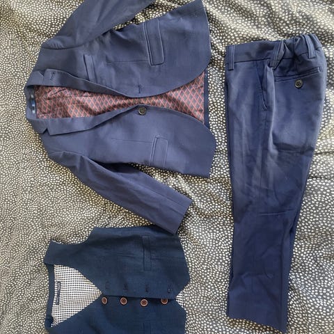 H&M dressett for gutt i størrelse 98. Sett består av blå dressjakke og bukse i bomull, samt hvit skjorte. Pluss at skjorten er "Easy Iron" og krøller seg ikke så lett. Dressen har klassisk snitt med knepping foran på jakken og lommedetaljer, og buksen har lommer og beltehemper. Skjorten er langermet med krage og knappelukking foran. Materiale hovedsakelig i bomull, som gir et mykt og behagelig plagg for barn.